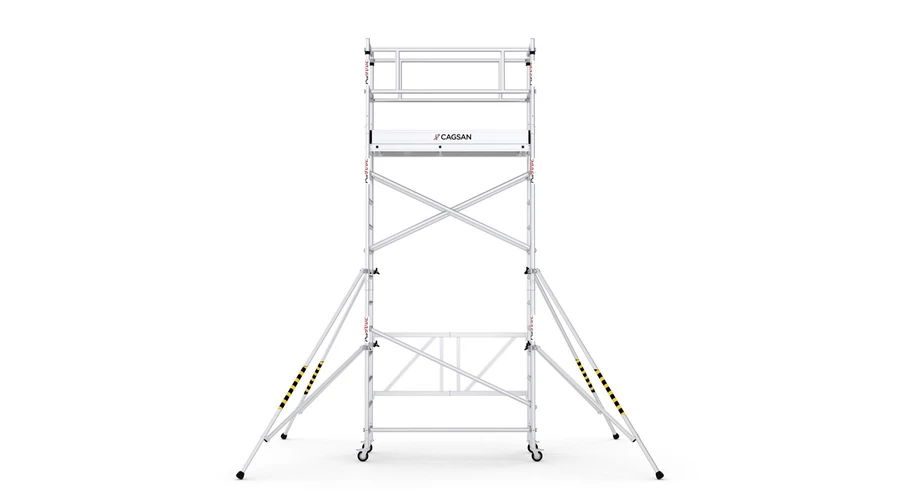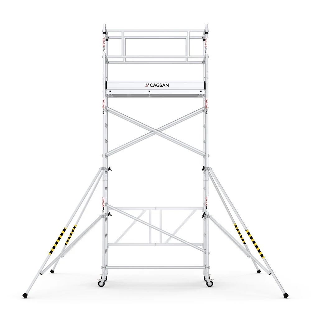 A ProTUBE F360 modell oldalsó lábai biztonságosabb munkakörnyezetet teremtenek az alapterület kiterjesztésével. Az állvány alumínium anyagból készült, így könnyű és könnyen mozgatható. A felépítés egyszerű és kényelmes. 5,65 m-ig állítható munkamagasság.