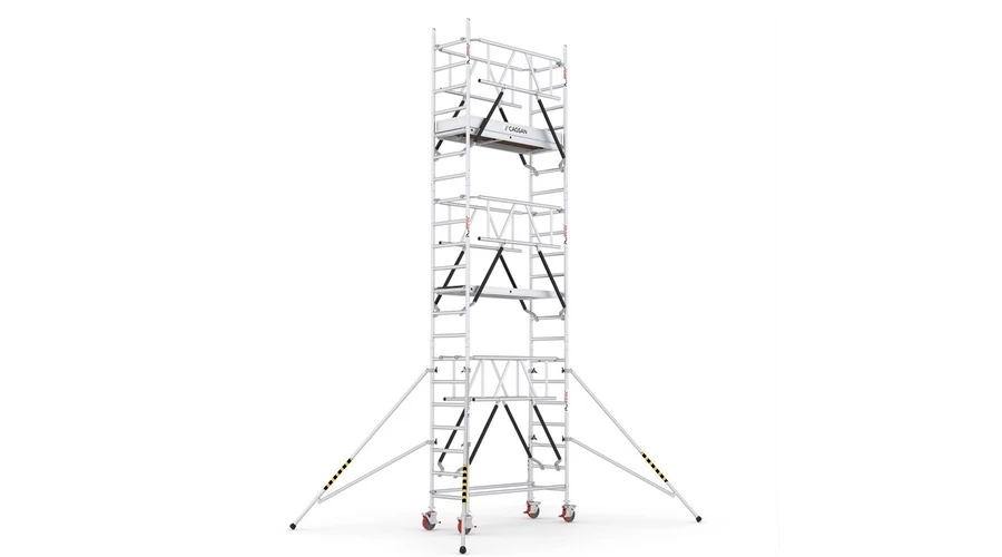 A legfelső emeleten található munkaállványhoz rögzíthető lábtartónak köszönhetően megszűnik annak a veszélye, hogy a munka közben leessen a dolgozó.