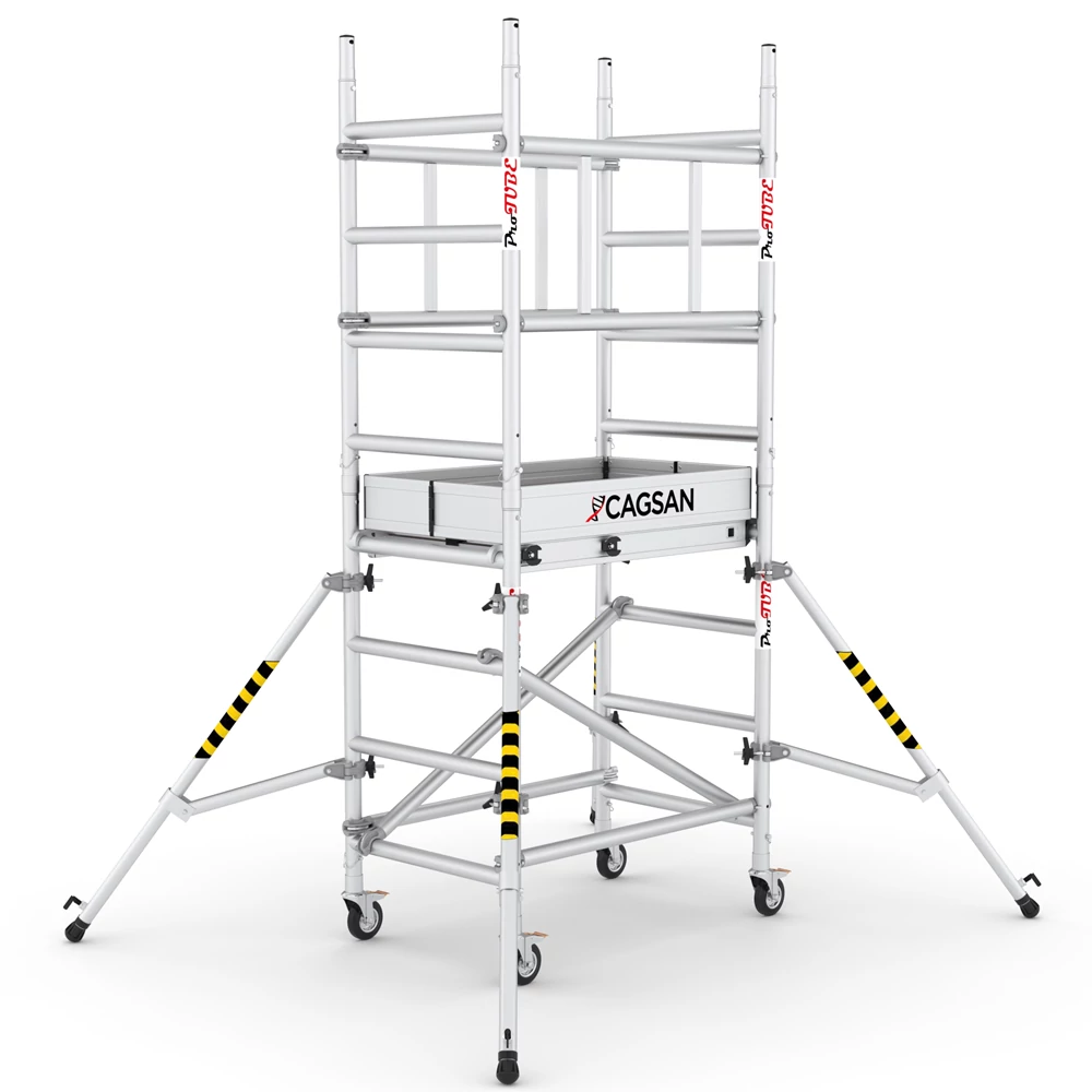 Gyakorlati összeszerelés: A PROTUBE Solo Mini gyorsan felszerelhető praktikus rögzítőberendezéssel. Biztonságosabb munkakörnyezet teremthető az alapterület oldalsó nyitólábakkal történő bővítésével.