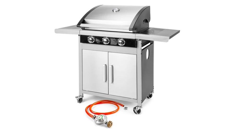 Ismerje meg a Fieldmann FZG 3005 gázgrillt - a tökéletes választás minden sütés-főzés kedvelőjének! Ez a kiváló minőségű gázgrillsütő minden szempontból megfelel az igényeknek, és kihagyhatatlan kiegészítője minden kertnek. három rozsdamentes acél égőfej rendkívüli teljesítményt biztosít, és azok egymástól függetlenül is használhatók, így lehetőség nyílik a különböző hőmérsékletek beállítására. Az egyszerű indítást az integrált gyújtási rendszer teszi lehetővé, míg a beépített hőmérő segítségével mindig ellenőrizheti a megfelelő hőmérsékletet. A grillsütő két oldalán elhelyezett munkalapok kiváló helyet biztosítanak az ételek előkészítéséhez vagy már elkészült ételek tálalásához. A kerekeinek köszönhetően a grillsütő könnyen mozgatható, így bárhová elviheti, ahol éppen szüksége van rá. Az energiát az 5 kg vagy 10 kg gázpalackok biztosíthatják, a csomag tartalmazza a szükséges csatlakozó tömlőt. grillsütő méretei (122 x 57 x 112 cm) és a nagy grill felület (60 x 42 cm) ideálisak mindennemű sütéshez és grillezéshez. A rozsdamentes acél fogantyúk és kezelőpanel modern és elegáns megjelenést kölcsönöznek a grillsütőnek, miközben ellenállnak az időjárási viszontagságoknak. Élvezze a sütés és grillezés örömeit a Fieldmann FZG 3005 gázgrill segítségével!