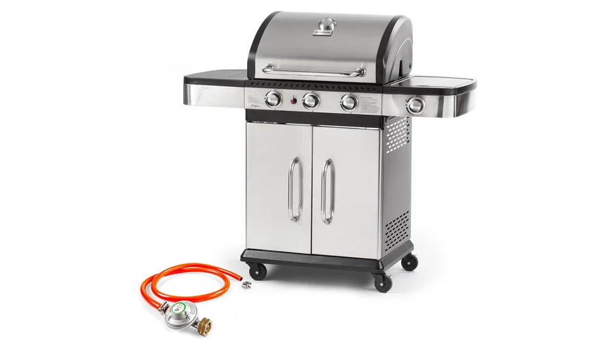 Ismerje meg a Fieldmann FZG 3011 gázgrillt - az ideális kiegészítő minden kerti sütés-főzés kedvelőjének! Ez a kiváló minőségű gázgrillsütő mindazt nyújtja, amire szüksége van ahhoz, hogy kertjében vagy teraszán kényelmesen és stílusosan élvezhesse a sütés és grillezés élményét. A három rozsdamentes acél égőfej, kiegészítve az oldalsó gázégővel, egyedülálló teljesítményt biztosítanak. Ezek egymástól függetlenül használhatók, így változatos hőmérsékleteket állíthat be az ételei elkészítése során. Az egyszerű indítást a beépített gyújtási rendszer biztosítja, míg a beépített hőmérő lehetővé teszi, hogy mindig ellenőrizze a sütőtér hőmérsékletét. A grillsütő egy oldalára praktikus munkalapot is terveztünk, így kényelmesen előkészítheti az ételeket vagy tálalhatja azokat. A kerekeinek köszönhetően könnyen mozgatható, így bárhová elhelyezheti a kertben vagy teraszán. Az energiaforrást az 5 kg vagy 10 kg gázpalackok biztosíthatnak, amelyeket könnyen csatlakoztathat a mellékelt csatlakozó tömlővel. A grillsütő méretei (122 x 57 x 112 cm) és a tágas grill felület (60 x 42 cm) ideálisak mindennemű sütéshez és grillezéshez. A rozsdamentes acél fogantyúk és kezelőpanel nemcsak modern megjelenést kölcsönöznek, hanem ellenállnak az időjárási viszontagságoknak is. A mozgatást segítő kerekek segítségével könnyen szállíthatja és pozícionálhatja a grillsütőt a kertjében. Élvezze a sütés és grillezés örömeit a Fieldmann FZG 3011 kiváló minőségű, stílusos gázgrillsütővel!