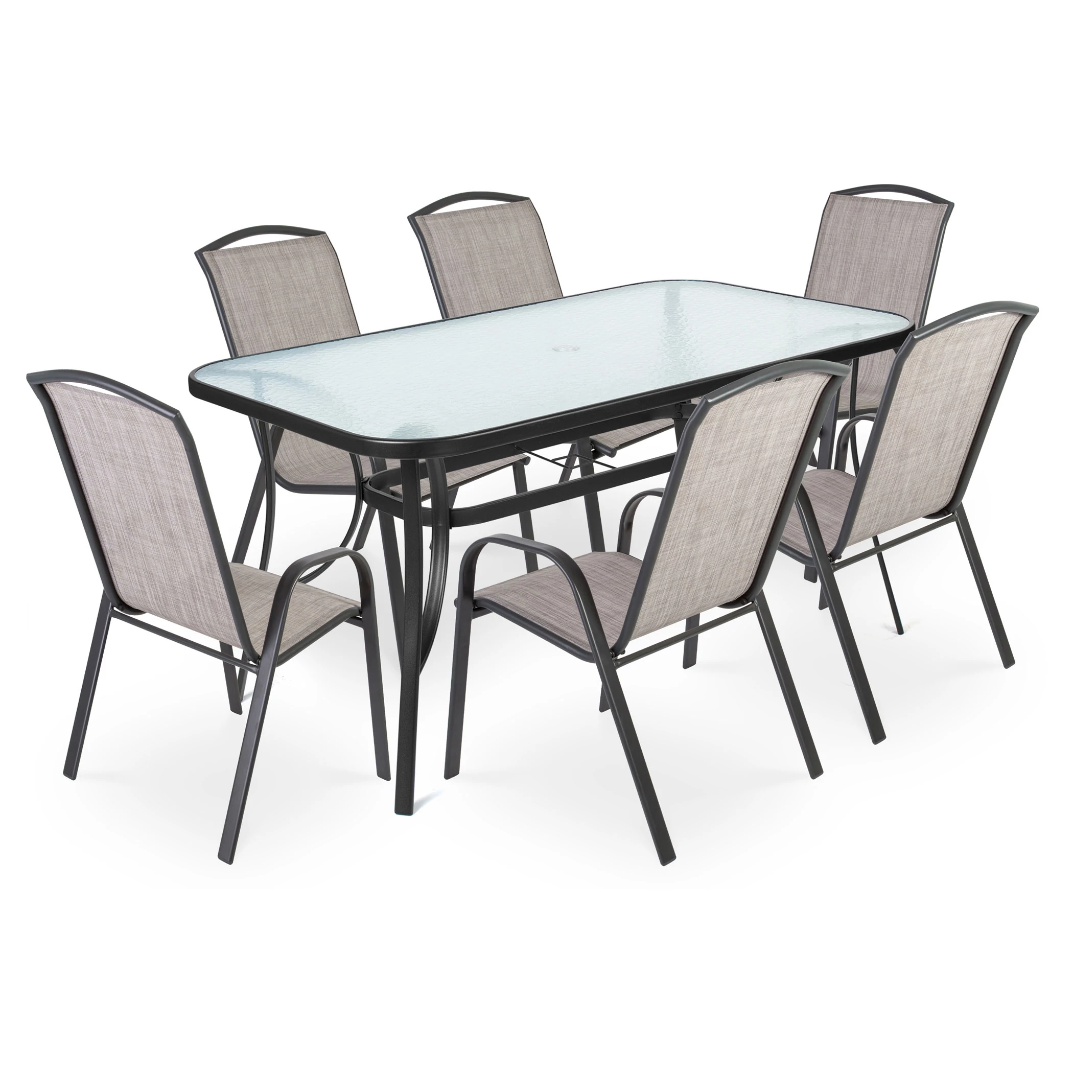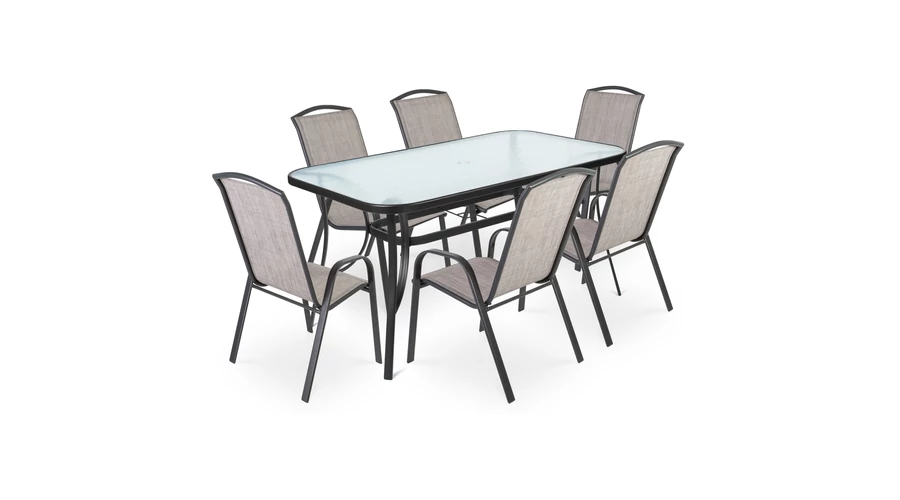Fedezze fel a Fieldmann RONY I. LIGHT kerti bútor szettet, mely magában hordozza az elegancia és időtlenség jegyeit. Kiváló választás kertekbe vagy teraszokra, ez a szett olyan kényelmet és stílust kínál, melyek a prémium minőség és design tökéletes egyensúlyát hozzák létre. A RONY I. LIGHT szett egy 150 x 96 x 71 cm-es, négyszögletes asztalt tartalmaz, amit nemesacél váz és edzett, átlátszó üveglap jellemez. Az asztal kialakított napernyőnyílással rendelkezik, így kellemes árnyékban élvezheti a szabadban eltöltött időt. A szett továbbá hat fémvázas széket foglal magában, melyek szintetikus szövettel vannak borítva, és magasított háttámlával és karfával rendelkeznek. A RONY I. LIGHT szék méretei: 55 x 73 x 94 cm, maximális terhelhetősége pedig 120 kg székenként. A szett szürke és fekete színkombinációja modern és elegáns megjelenést kölcsönöz a kertjének vagy teraszának. Az acélból készült váz nemcsak erős és strapabíró, hanem könnyen tisztítható is. A székek egymásra helyezhetők, így tárolásuk rendkívül praktikus. Hozza létre álmai kertjét vagy teraszát a Fieldmann RONY I. LIGHT kerti bútor szettel, mely nemcsak esztétikus, hanem hosszú élettartamú és ellenálló is. Élvezze a kényelmet és a stílust a szabadban!