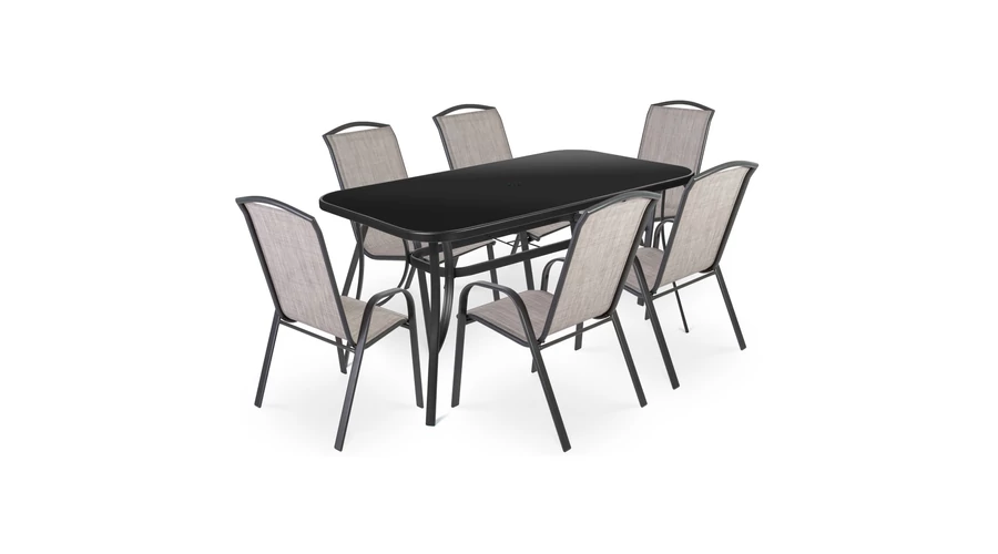 Fedezze fel a Fieldmann RONY II. LIGHT kerti bútor szettet, mely magában hordozza az elegancia és időtlenség jegyeit. Kiváló választás kertekbe vagy teraszokra, ez a szett olyan kényelmet és stílust kínál, melyek a prémium minőség és design tökéletes egyensúlyát hozzák létre. A RONY II. LIGHT szett egy 150 x 96 x 71 cm-es, négyszögletes asztalt tartalmaz, amit nemesacél váz és edzett, fekete üveglap jellemez. Az asztal kialakított napernyőnyílással rendelkezik, így kellemes árnyékban élvezheti a szabadban eltöltött időt. A szett továbbá hat fémvázas széket foglal magában, melyek szintetikus szövettel vannak borítva, és magasított háttámlával és karfával rendelkeznek. A RONY II. LIGHT szék méretei: 55 x 73 x 94 cm, maximális terhelhetősége pedig 120 kg székenként. A szett szürke és fekete színkombinációja modern és elegáns megjelenést kölcsönöz a kertjének vagy teraszának. Az acélból készült váz nemcsak erős és strapabíró, hanem könnyen tisztítható is. A székek egymásra helyezhetők, így tárolásuk rendkívül praktikus. Hozza létre álmai kertjét vagy teraszát a Fieldmann RONY II. LIGHT kerti bútor szettel, mely nemcsak esztétikus, hanem hosszú élettartamú és ellenálló is. Élvezze a kényelmet és a stílust a szabadban!