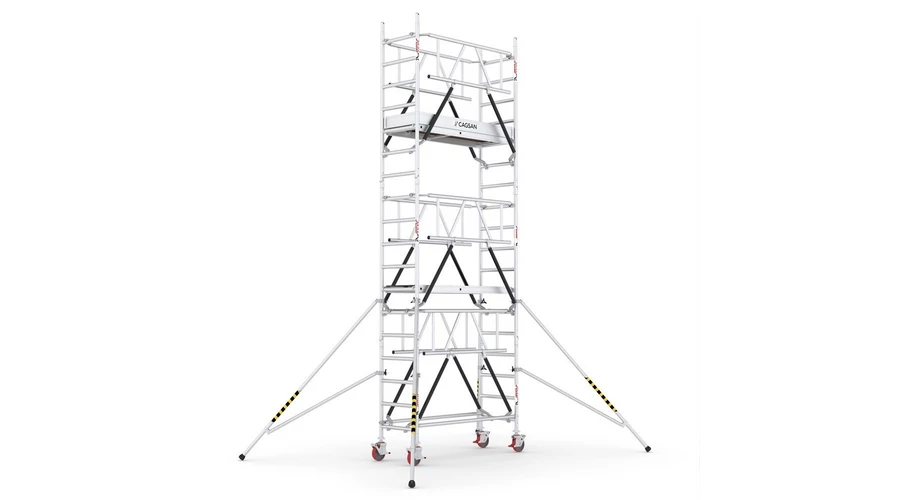 A legfelső emeleten található munkaállványhoz rögzíthető lábtartónak köszönhetően megszűnik annak a veszélye, hogy a munka közben leessen a dolgozó.