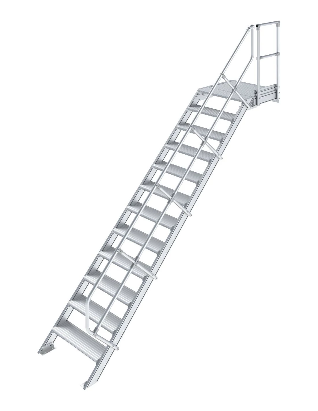 Robusztus alumíniumlépcső ajtók vagy közbenső szintek biztonságos megközelítéséhez, az EN ISO 14122 szabványnak megfelelően.