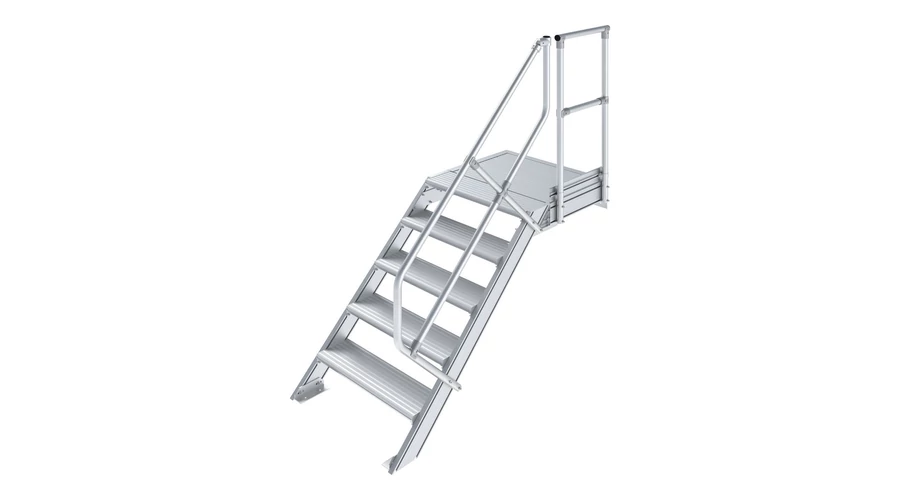 Robusztus alumíniumlépcső ajtók vagy közbenső szintek biztonságos megközelítéséhez, az EN ISO 14122 szabványnak megfelelően.
