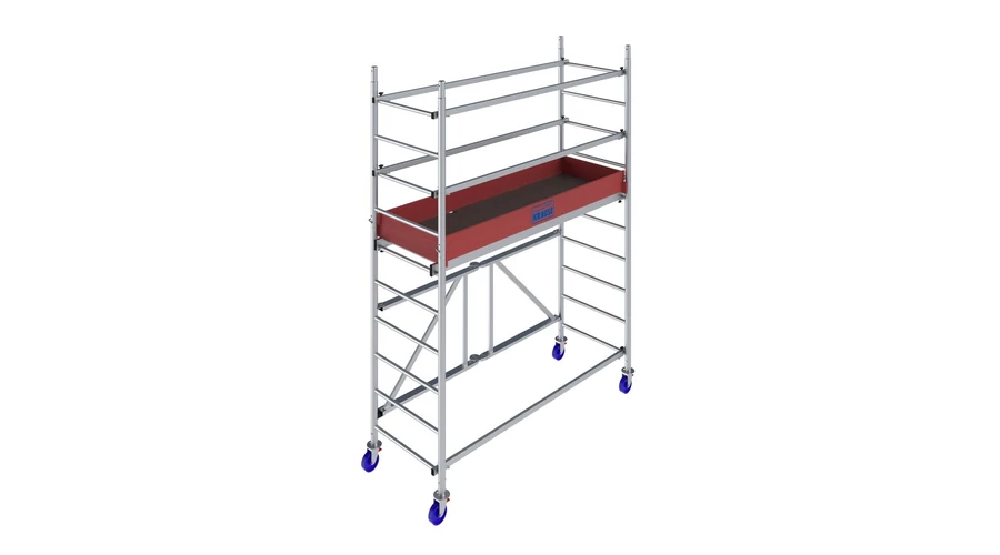 Gyorsan felépíthető és könnyen szállítható alumínium összecsukható állvány fékezhető kerekekkel bel- és kültéri munkákhoz kisebb magasságban.
