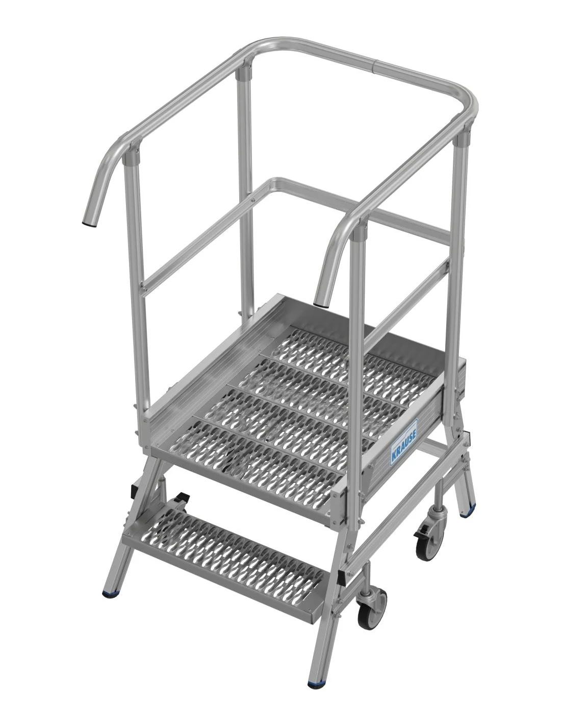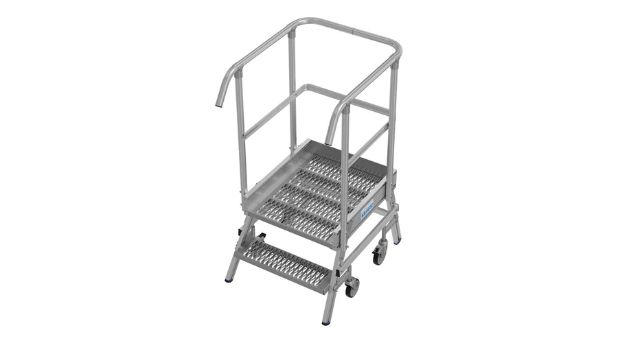 Két oldalon járható gurítható alumínium dobogó 180 mm mély lépcsőfokokkal és nagy állófelülettel R13 csúszásmentes profilrácsból, amely körbefutó dobogókorláttal van felszerelve a biztonságos és kényelmes munkavégzés érdekében