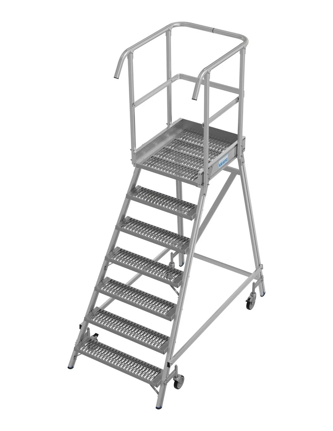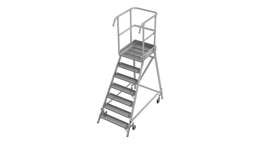 Két oldalon járható gurítható alumínium dobogó 180 mm mély lépcsőfokokkal és nagy állófelülettel R13 csúszásmentes profilrácsból, amely körbefutó dobogókorláttal van felszerelve a biztonságos és kényelmes munkavégzés érdekében
