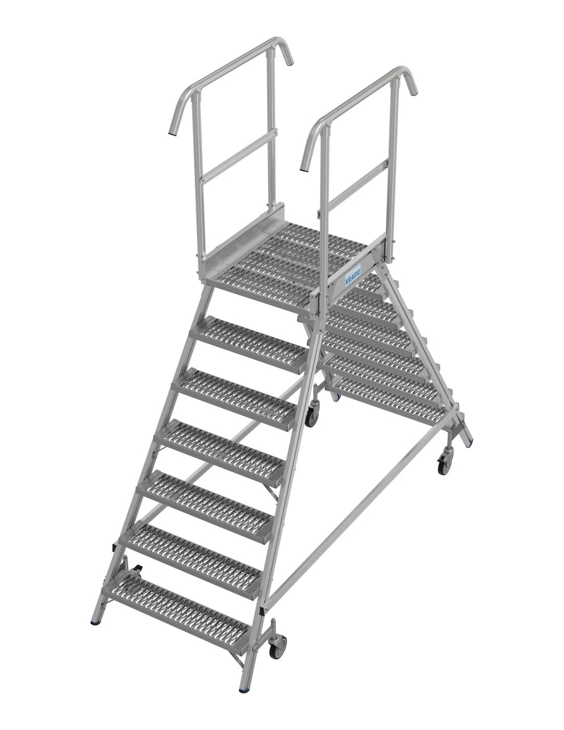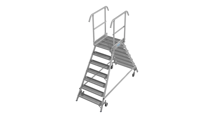 Két oldalon járható gurítható alumínium dobogó 180 mm mély lépcsőfokokkal és nagy állófelülettel R13 csúszásmentes profilrácsból, amely körbefutó dobogókorláttal van felszerelve a biztonságos és kényelmes munkavégzés érdekében