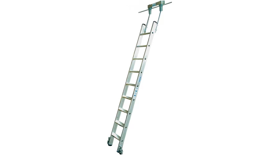- A létra dőlése 21°, tárolási helyzetben helytakarékosan helyezkedik el függőlegesen a polc mellett
