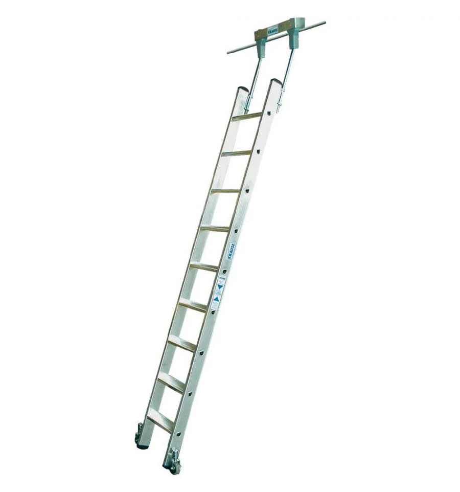 • A létra dőlése 21°, tárolási helyzetben helytakarékosan helyezkedik el függőlegesen a polc mellett