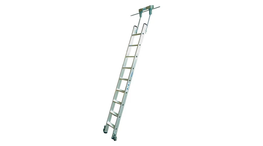 - Lépcsőfokos alumínium polclétra a T-sínrendszerhez használható integrált futószerkezettel.