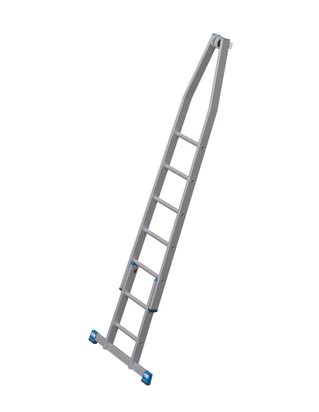 A létra felső tagja fali vezetőgörgőkkel és kopásálló, puha gumi anyagú érintkező blokkal, ékkivágással, mely házsarkakra és ablakprofilokra helyezhető