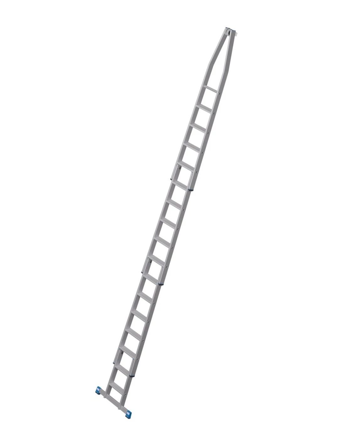A létra felső tagja fali vezetőgörgőkkel és kopásálló, puha gumi anyagú érintkező blokkal, ékkivágással, mely házsarkakra és ablakprofilokra helyezhető