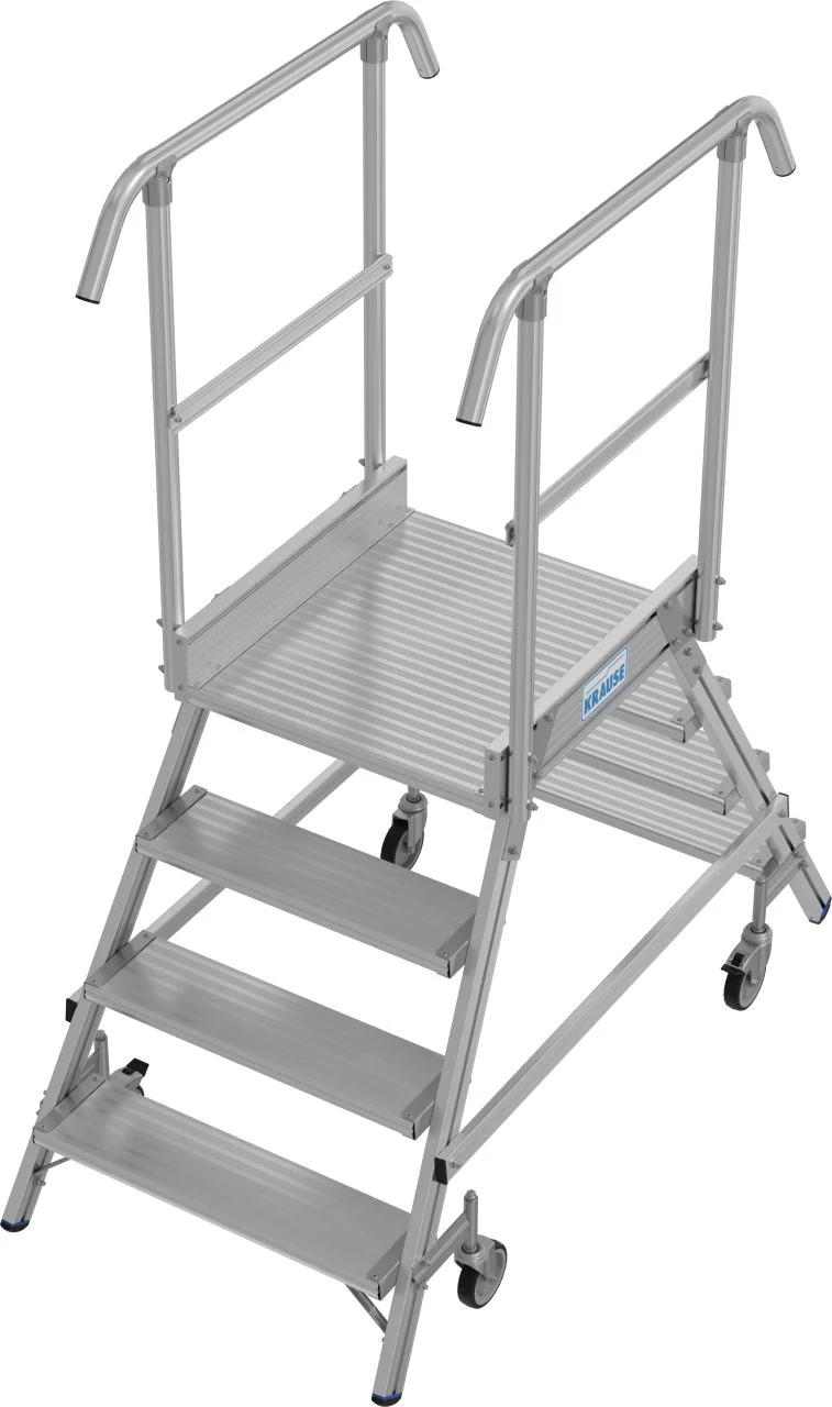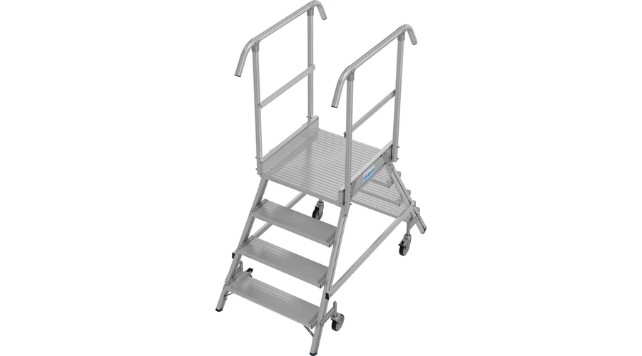 + Két oldalon járható gurítható alumínium dobogó 175 mm mély, csúszásmentes lépcsőfokokkal és nagy állófelülettel, amely körbefutó dobogókorláttal van felszerelve a biztonságos és kényelmes munkavégzés érdekében + Kis állószélesség, ideális a polcok közelében végzett munkához
