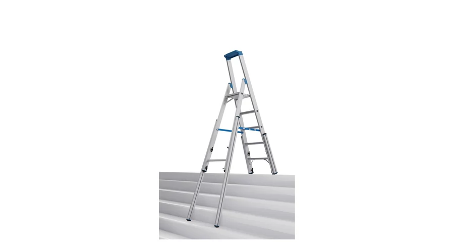 Robusztus, egy oldalon járható alumínium teleszkópos létra 4 szárhosszabbítóval professzionális használatra lépcsőkön, sarkokban, emelvényeken és hasonló magasságkülönbségek esetén.