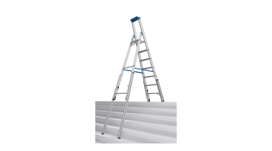 Robusztus, egy oldalon járható alumínium teleszkópos létra 4 szárhosszabbítóval professzionális használatra lépcsőkön, sarkokban, emelvényeken és hasonló magasságkülönbségek esetén.