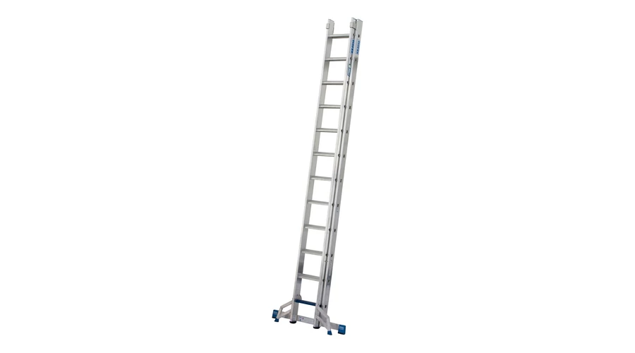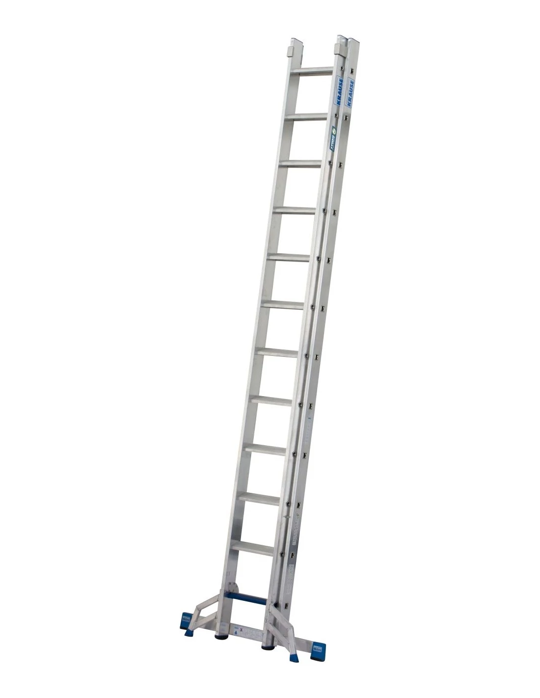 Stabil, kétrészes tolólétra létrafok/lépcsőfok kombinációval, TRBS 2121-2 szerinti alkalmazáshoz. Az új, innovatív létrafok/lépcsőfok kombinációnak köszönhetően a létrák feljutást segítő eszközként és munkaterületként is használhatóak. Az innovatív KRAUSE Trigon kitámasztónak köszönhetően a 2x12 tolólétra létratagjai különállóan is használhatóak.