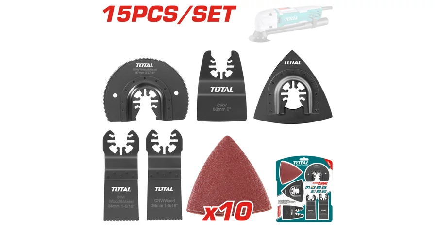 TOTATL TAKTMT1502 (készlet) multifunkciós elektromos szerszámhoz készült. Fa, fém vágására, különböző anyagok csiszolására és tisztítására használják. Az egyes szerzsám darabok anyaga króm-vanádium acél (CrV).