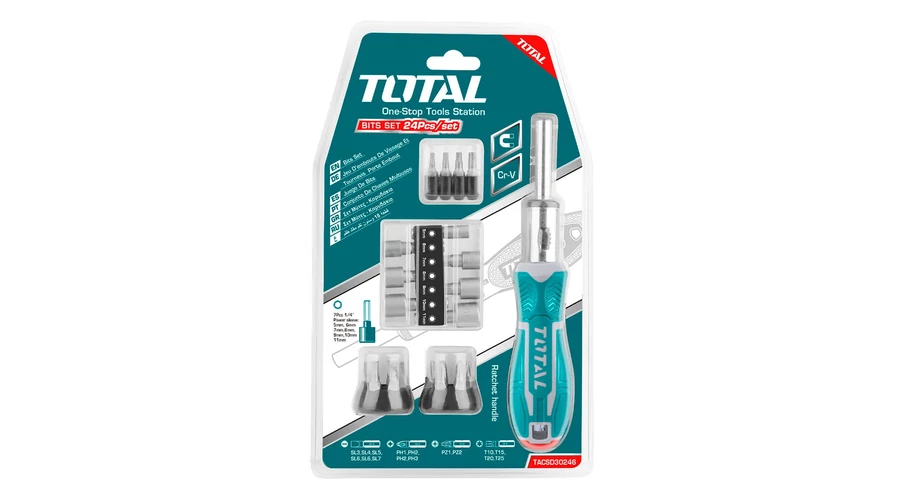 A többcélú csavarhúzó készlet TOTAL TACSD30246 egy univerzális 24 az 1-ben kézi eszköz, ami ideális házi, javítási, építési, összeszerelési és szétszerelési munkákhoz. Tartalmaz egy magas minőségű, fogaskerekes markolatot, valamint számos dugófejet és bitfejet különböző típusú horonnyal (PH, SL, P, TORX). Az ilyen felszerelés széles körű rögzítőelem karbantartási műveleteinek végzését teszi lehetővé. Az összes munkafelületet minőségi Cr-V szénacélból készítik, ami magas szilárdságot, tartósságot és korrózióállóságot biztosít az eszköznek.
