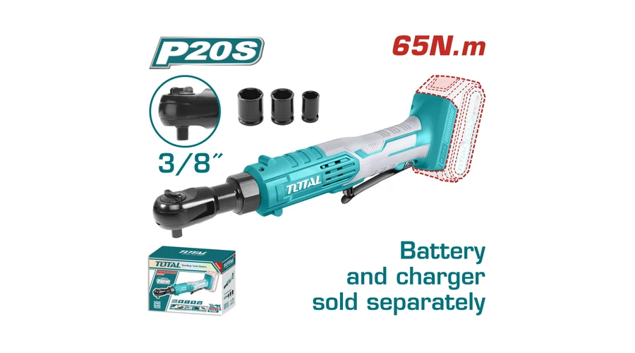 Az 20V-os akkus racsnis csavarkulcs 65Nm maximális forgatónyomatékkal rendelkezik és 3/8″-es négylapos befogással rendelkezik. Üresjárati fordulatszáma 250/perc. A csomag tartalmazza a 13, 17 és 19 mm-es dugókulcsokat. Az akkumulátor és a töltő külön megvásárolható. Színes kartondobozban érkezik.
