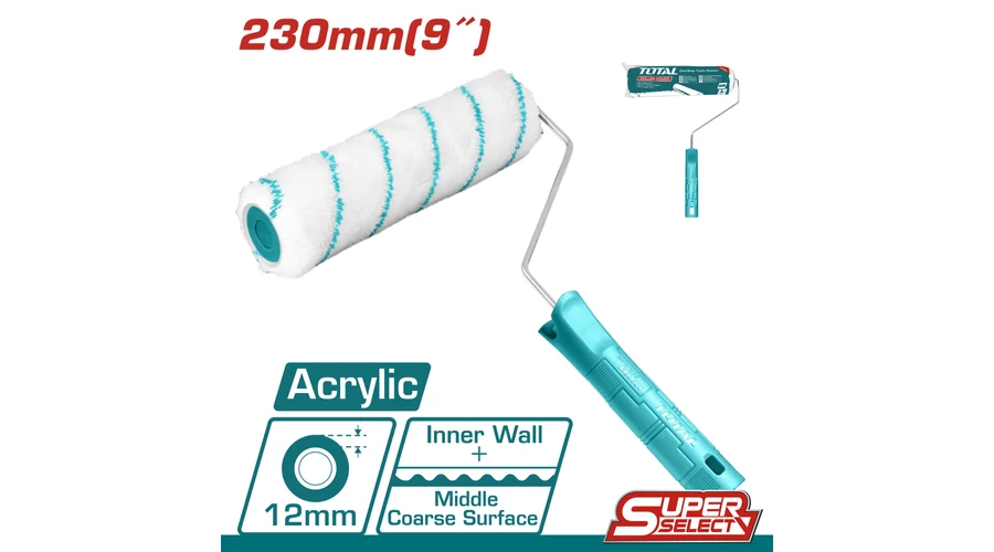 A TOTAL THT85096 színes hengercsel a belső falak festésére szolgál. A henger mérete 230 mm. A szőr anyaga akril, hossza pedig 12 mm. A bevonat megbízható ragasztással történő rögzítésének köszönhetően a hengercsel rendkívül kopásálló, megakadályozza a leválást. A hengercsel egyenletesen viszi fel a festéket a felületre, ami megkönnyíti és gyorsabbá, egyszerűbbé teszi a festés folyamatát. Az ergonomikus műanyag markolat, a fogantyúhoz való függesztés nyílása és alacsony súlya növelik a kényelmet a munka során ezzel az eszközzel. A hengercsel blistercsomagolásban van, könnyű tárolásra és szállításra.