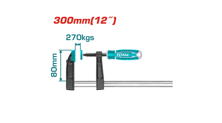 A TOTAL THT1320801 univerzális gyorsszorító (ipari sorozat) megbízhatóan köti össze a részeket. Ez a professzionális F-kapocs megbízható segítőtárs lesz az ácsok, lakatosok és otthoni mesterek számára. Az eszköz mérete 80×300 mm. A kapocs maximális ereje 270 kg. Az eszköz fő munkarészei a munkahelyi rögzítő fogak, két támasztó tartó és vezető. A ház magas minőségű acélból készült, így az eszköz nagy terheléseket bír el és kiemelkedik azáltal, hogy növeli a kopásállóságot. Az antikorrozív bevonat meghosszabbítja az eszköz élettartamát. A két komponensből álló, gumi borítású fogantyúk kényelmet biztosítanak a kapocs működtetése során, és a munkafolyamatot kényelmesebbé teszik.