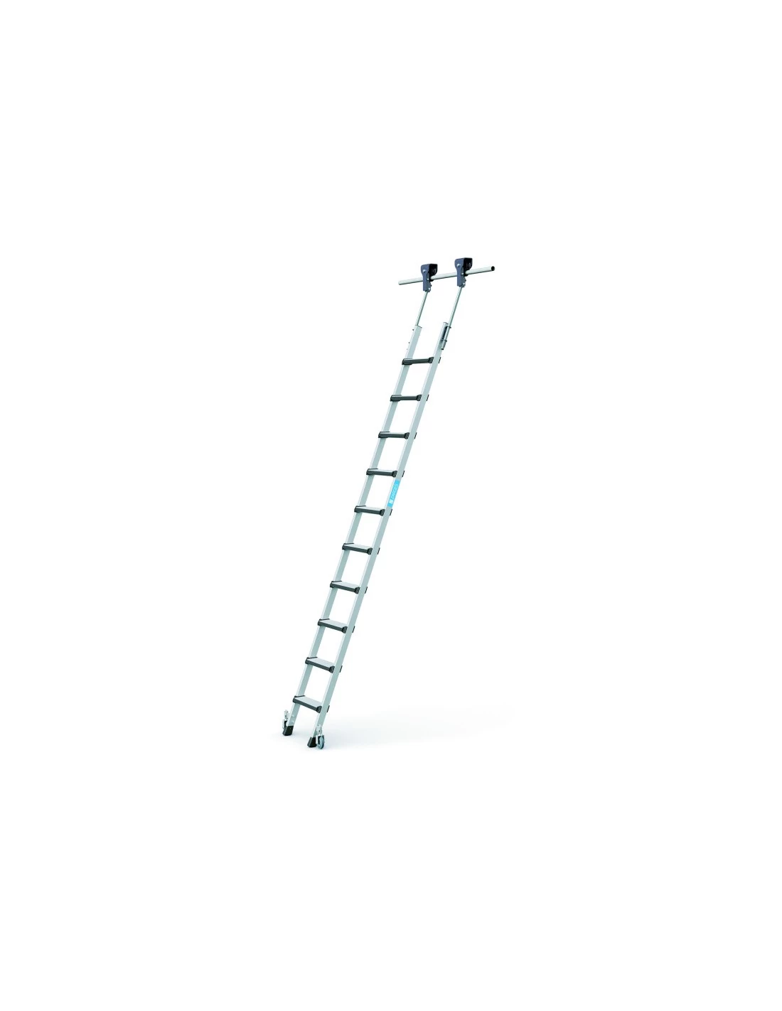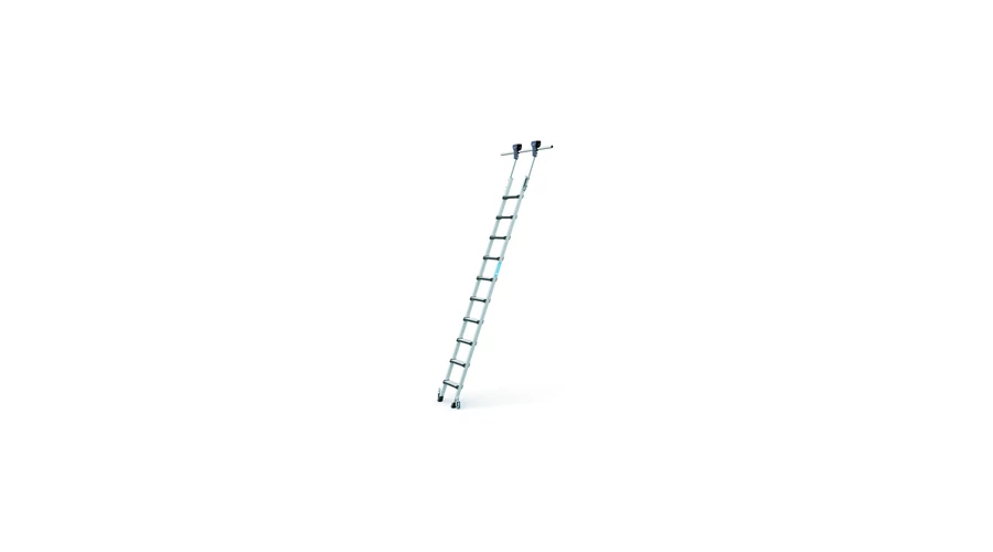 A mozgatható létrafej és a fékezhető rugós kerekek terhelés esetén reteszelik a polclétrát.
