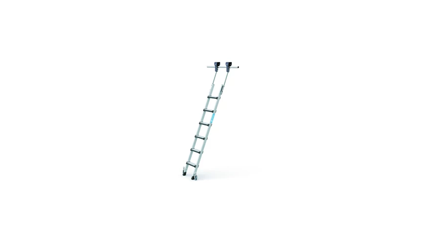 A mozgatható létrafej és a fékezhető rugós kerekek terhelés esetén reteszelik a polclétrát.