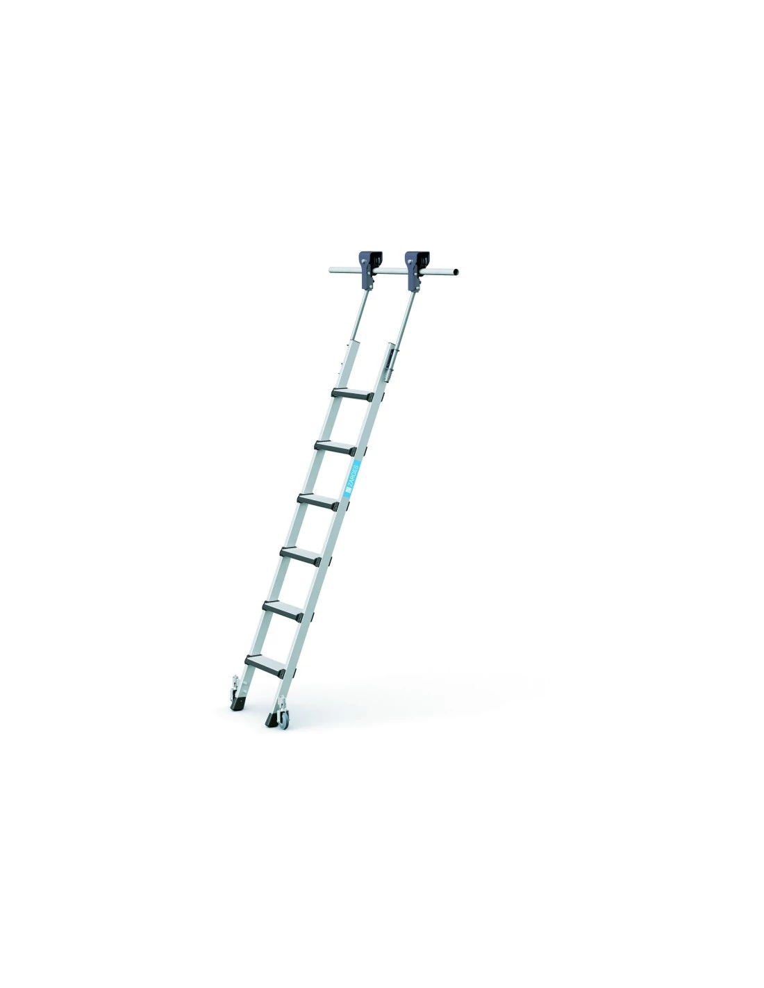 Használaton kívül a létra helytakarékosan elhelyezhető a polc mellett.